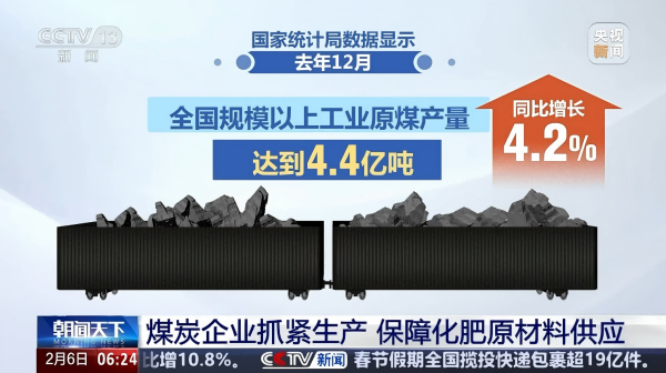 統(tǒng)計局數(shù)據(jù)顯示,去年12月,全國規(guī)模以上工業(yè)原煤產(chǎn)量達到4.4億噸,同比增長4.2%,2024年全年,規(guī)模以上工業(yè)原煤產(chǎn)量為47.6億噸,同比增長1.3%。原煤產(chǎn)量創(chuàng)歷史新高,為能源安全和化肥生產(chǎn)提供了有力保障。(央視新聞客戶端)