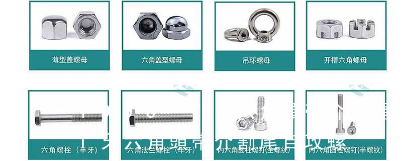六角螺絲(栓) HEX HEAD CAP SCREWS(HEX BOLTS) 六角機械螺絲 HEX HEAD MACHINE BOLTS 六角木牙螺絲 HEX LAG BOLTS 四角螺絲 SQUARE HEAD BOLTS T頭螺絲 T HEAD BOLTS 馬車螺絲 CARRIAGE BOLTS 環(huán)首螺絲 EYE BOLTS 內(nèi)六角孔螺絲 HE 主要分類包括普通螺絲、機螺絲、自攻螺絲和膨脹螺絲三種。有頭螺釘Cap screw 過去限于全牙的扣件。六角頭螺釘Hex cap screw與大六角螺栓Hex bolt 顧名思義為頭部為六角型的外螺紋扣件,設(shè)計為使用扳手轉(zhuǎn)動。依照ASME B18.2.