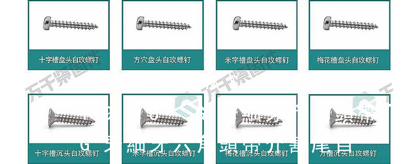 自攻平尾螺絲、自攻割尾螺絲、自攻自鉆螺絲、復合式鉆尾螺絲、雙牙鉆尾螺絲、六角頭木螺絲、三角牙螺絲、組合螺絲、吊環螺絲、壓鉚螺絲、管接頭螺絲、無頭螺絲、膨脹螺絲、無頭螺塞、內六角螺塞、圓柱頭螺塞、外六角螺塞、方