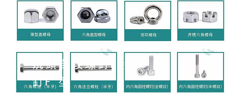 平杯)、半圓頭內六角螺釘(圓杯)、十字槽盤頭機螺釘、十字槽沉頭機螺釘、十字槽大扁頭機螺釘、十字槽盤頭自攻釘、十字槽沉頭自攻釘、十字槽大扁頭自攻釘、全牙絲桿(牙條)、六角螺母、法蘭螺母、尼龍螺母、蓋型螺母、蝶型